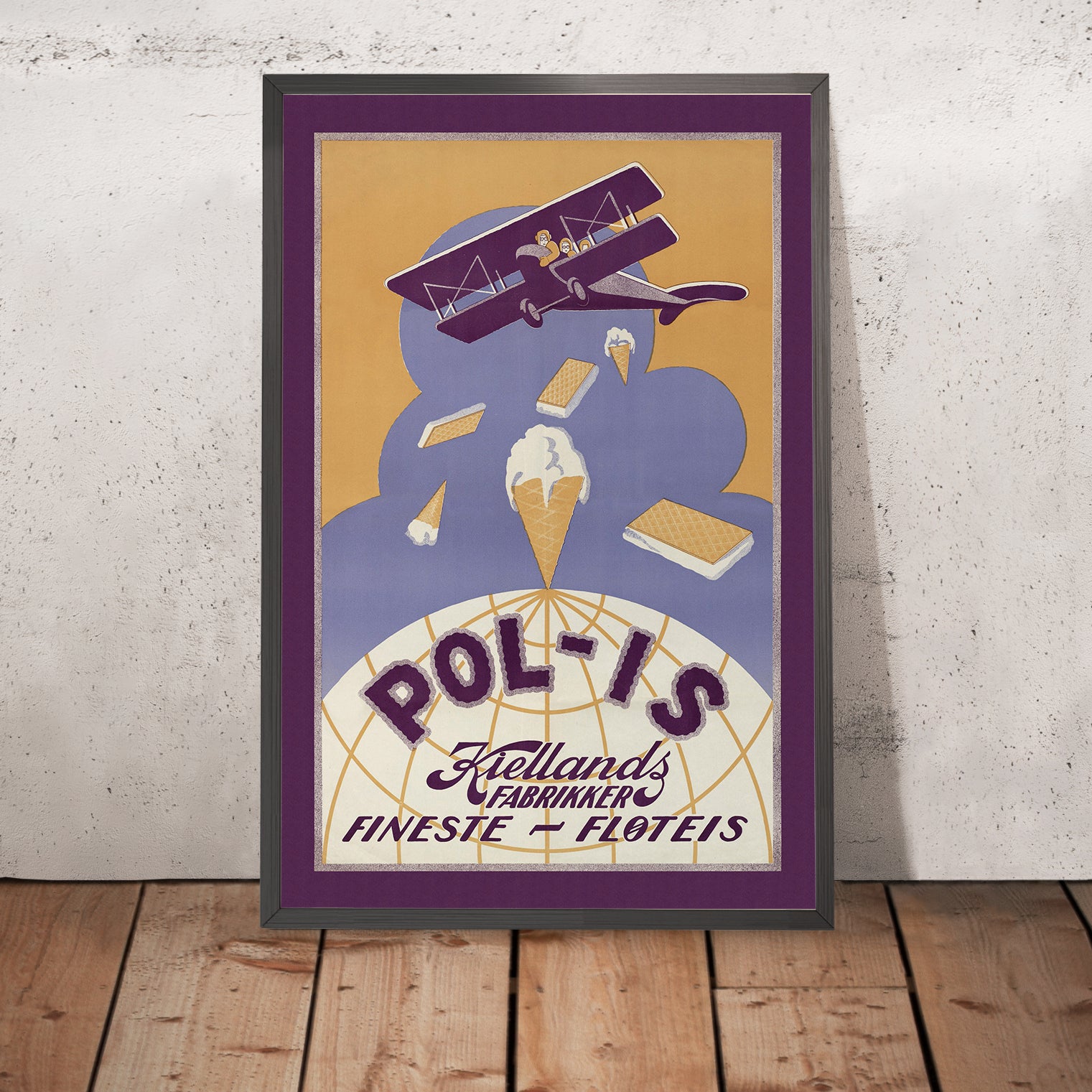 Why it matters: This poster channels the interwar fascination with speed and distance—an airplane slicing across a globe—while anchoring the scene in everyday pleasure: “Pol‑is” ice cream. The playful brand name nods to “polar” cool, a clever fit for Norway’s northern identity, and to the era’s embrace of refrigeration and café culture. Travel and taste fuse into a single promise of modern living, making the design especially resonant for anyone who has explored Norway or cherishes Nordic style.