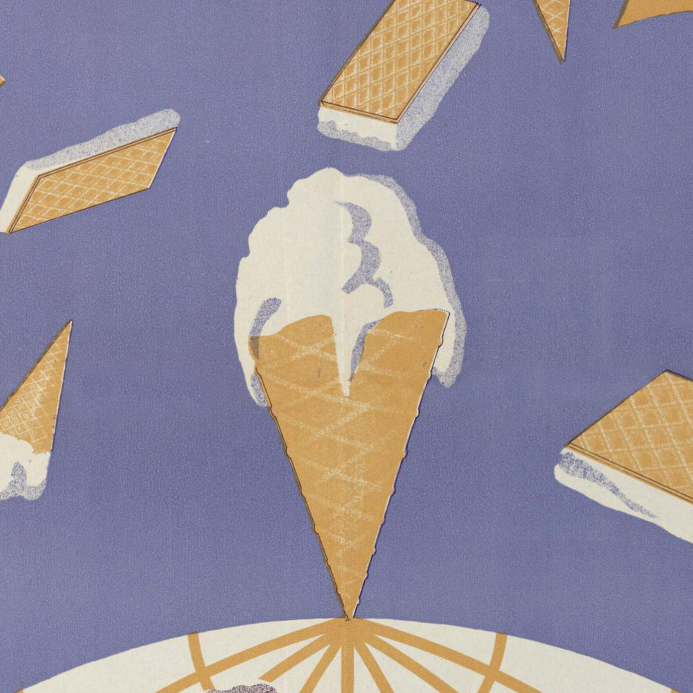 Design notes: A luminous gradient sweeps from warm gold into deep purple, with a touch of crisp blue that adds lift and freshness—perfect for an ice cream theme. Angular aircraft lines and the geometric latitude–longitude grid supply movement and order, while the rounded cones and scoops soften the composition with friendly, circular rhythms. Bold, stylized lettering amplifies the brand presence and reads beautifully from a distance, a textbook example of Art Deco clarity and impact. This is a statement piece for kitchens, dining rooms, cafés, or travel-inspired walls.