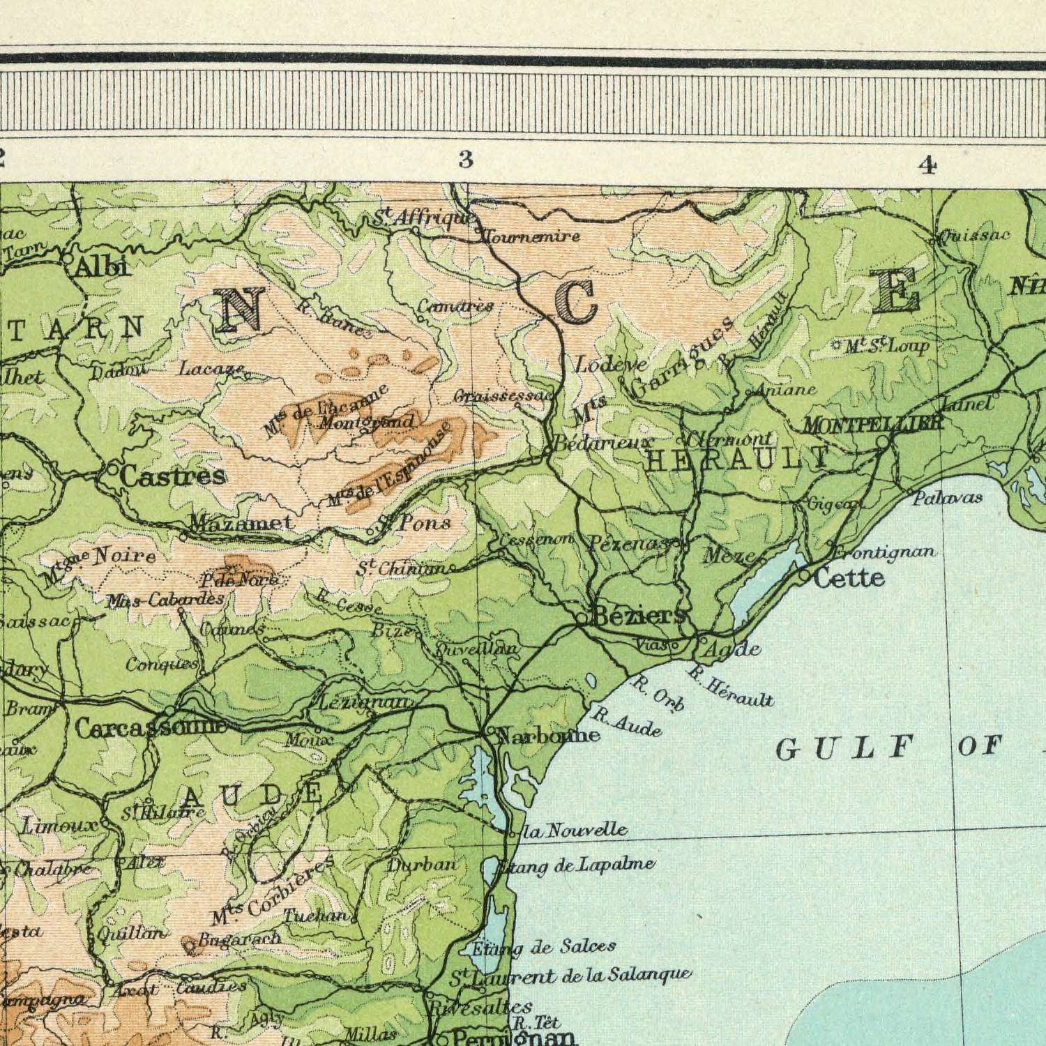 Further down the coast, Alicante, Murcia, and the marches toward Granada rise from bright coastal bands into the tawny ridges of the Iberian and Betic systems. The Segura’s parched basin contrasts with the snow-fed uplands of the Sierra Nevada, where spot heights culminate on the high crests that watch over Granada’s fertile vega. Inland, Albacete emerges as a hinge between the Levant and the Castilian meseta, while Madrid asserts itself amid the Tagus basin, its centrality emphasized by the convergence of regional boundaries. Along the Alboran shore, capes such as Palos and Gata mark changes in currents and seabed, mirrored offshore by bathymetric swales that guide the maritime routes plotted neatly across the page.
