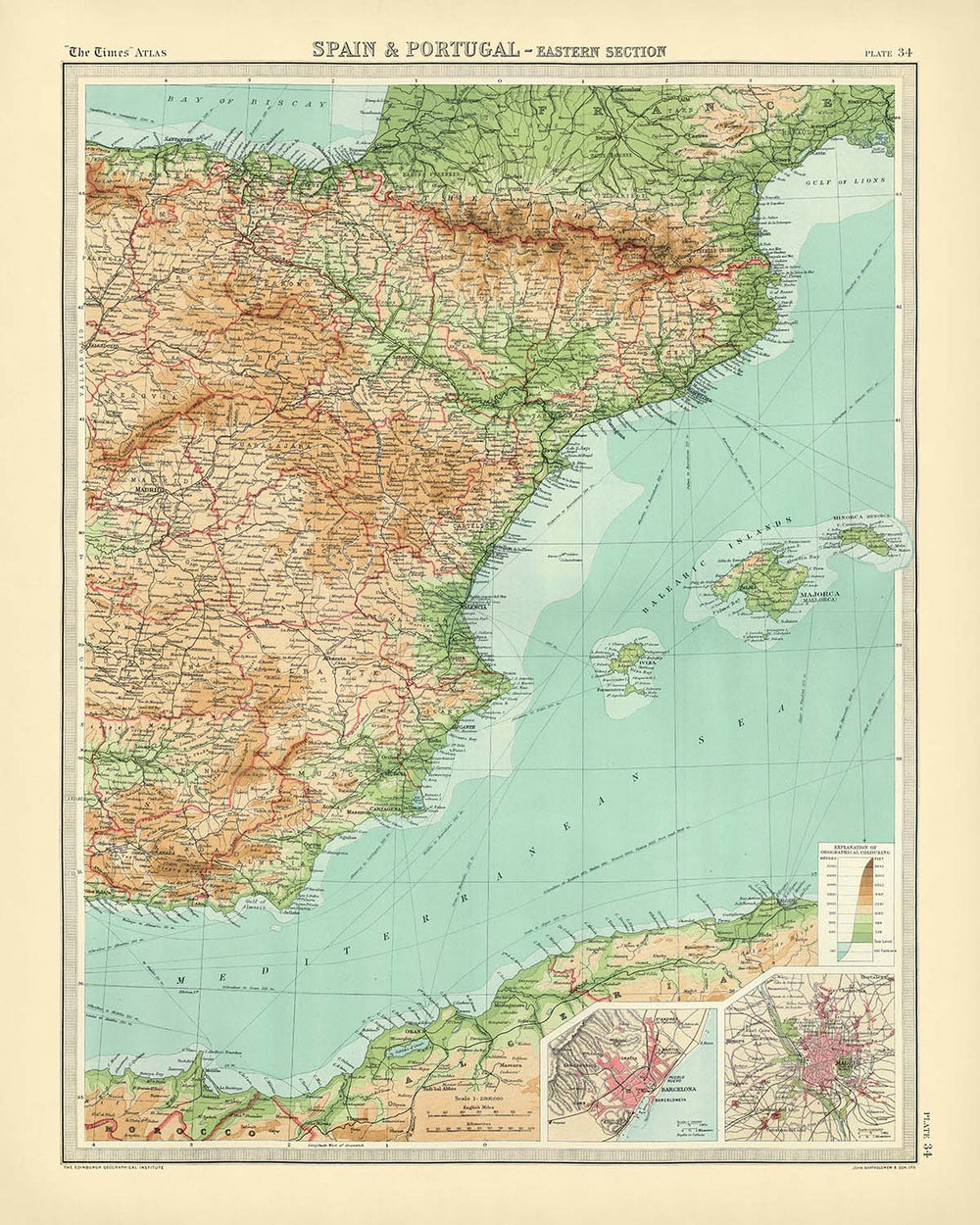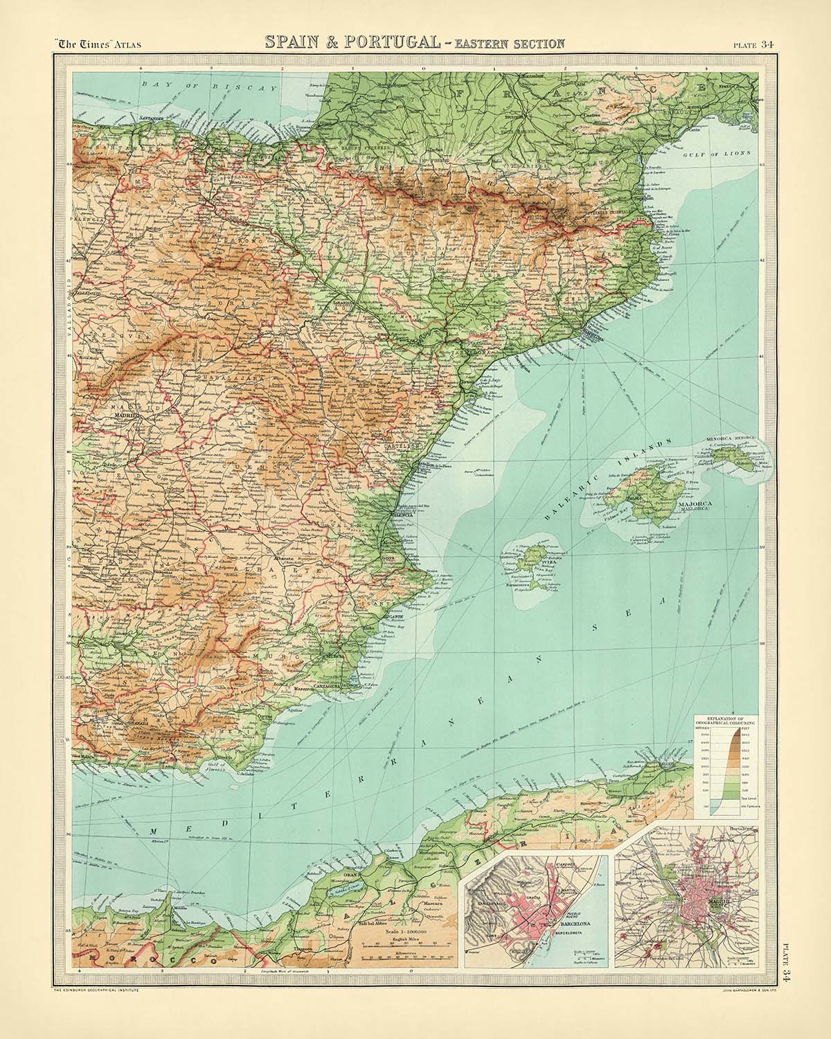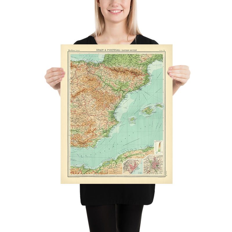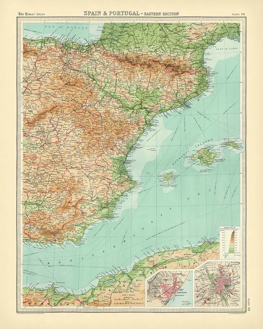 Spain & Portugal - Eastern Section presents the eastern sweep of the Iberian Peninsula with the lucid authority that made “The Times” Atlas a benchmark of its age. Political frontiers of Catalonia, Aragon, Valencia, Murcia, Andalusia, and Castile are crisply delineated, while hypsometric tints rise from coastal greens to tawny uplands that carry the eye toward the Pyrenees and Sierra Nevada. Bathymetric shading graduates the Balearic and Alboran seas, complementing marked shipping routes that stitch Barcelona, Valencia, and Alicante to Mediterranean ports beyond. Major cities—Barcelona, Madrid, Valencia, Tarragona, Castellón de la Plana, Alicante, Murcia, Granada, and Albacete—anchor the narrative of terrain and governance, while a focused inset of Barcelona heightens the map’s urban and maritime precision.