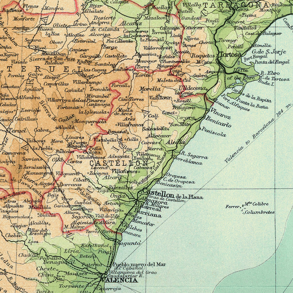 Old Map of Eastern Spain aby Bartholomew, 1922: Barcelona, Valencia, Pyrenees, Ebro Delta, Sierra Nevada