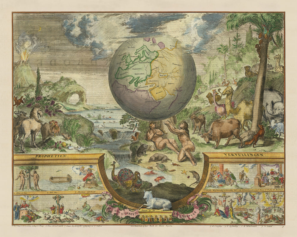 Ancienne illustration du jardin d'Eden, 1687 : carte du paradis de Romeyn De Hooghe