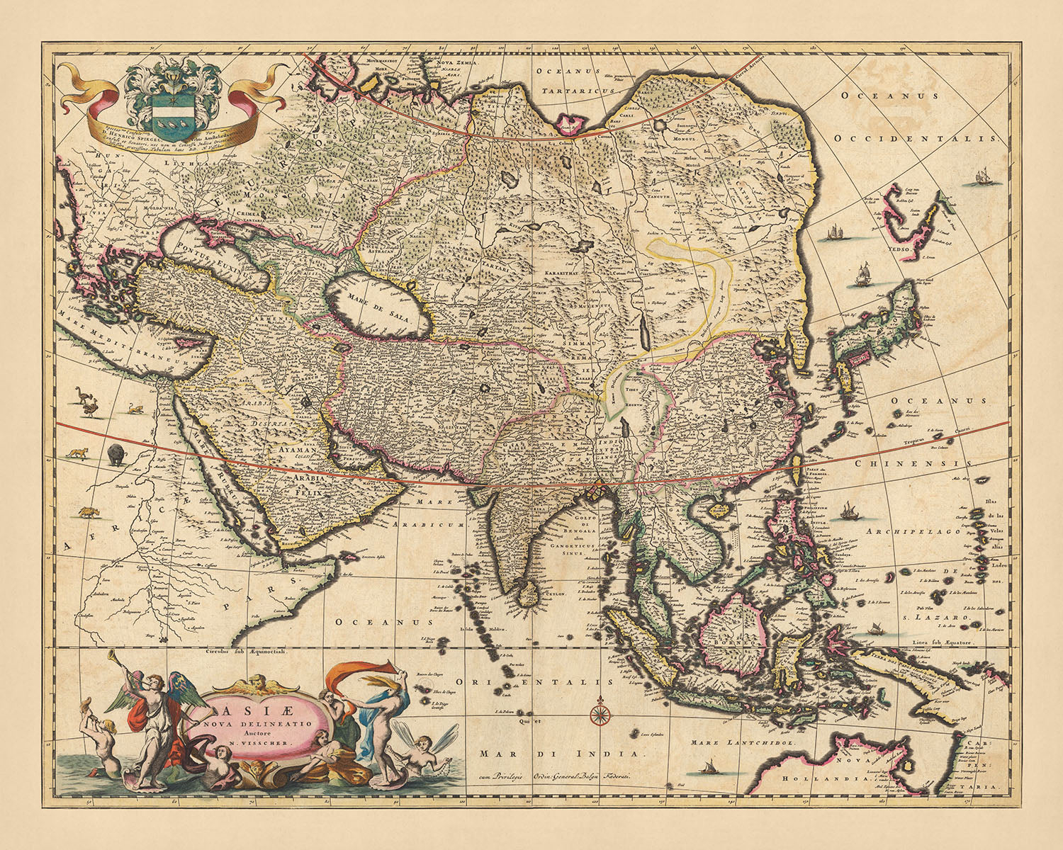 Ancienne carte de l'Asie par Visscher, 1690 : Moyen-Orient, Asie de l'Est, Asie centrale, Asie du Sud, Asie du Sud-Est