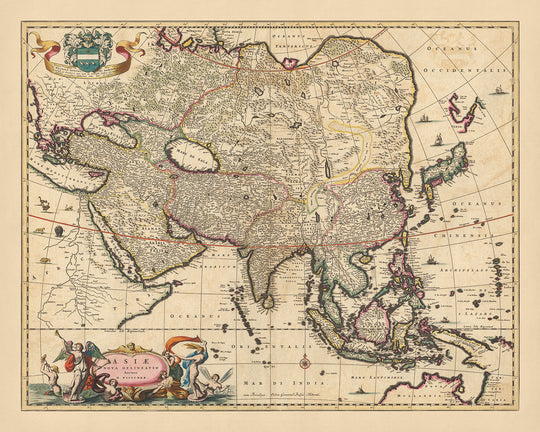 La « Asiae nova delineatio » est plus qu'une simple carte ; c'est une fenêtre sur une époque révolue. Il présente les divisions politiques de l’époque, donnant aux téléspectateurs un aperçu du réseau complexe de territoires qui s’étendait autrefois sur le continent asiatique. La carte s'étend à l'ouest jusqu'à la Turquie et l'Égypte, capturant l'étendue de l'influence asiatique, et au sud-est jusqu'à la limite supérieure de l'Australie, faisant allusion à l'exploration naissante de l'hémisphère sud. Les voies navigables, les canaux, les lacs et les montagnes sont tous méticuleusement représentés, reflétant la topographie naturelle de la région.