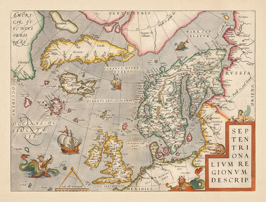Ancienne Carte de la mer du Nord et de l'Atlantique, 1575 avec mythique Frisland par Abraham Ortelius: Scandinavie, Îles Britanniques, Islande, Groenland