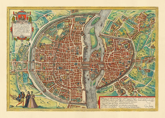 Publié en 1572 par Georg Braun et Frans Hogenberg, ceci est la plus ancienne carte complète et vraie de Paris. Si Shakespeare avait jamais visité Paris, c'est à quoi cela aurait ressemblé. Cette carte a été publiée pour la première fois dans Civitates Orbis Terrarum - les Villes du Monde - qui était un chef-d'œuvre cartographique comportant 546 cartes.