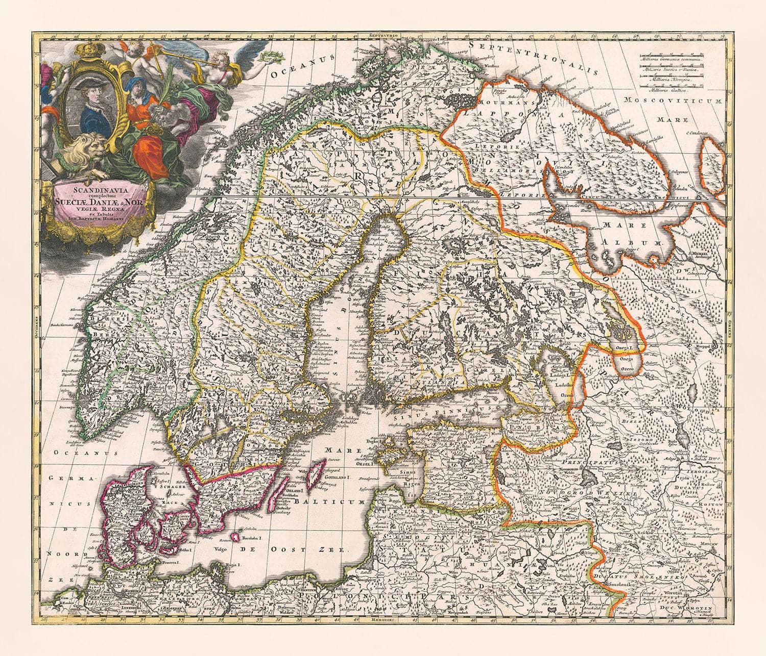 Ancienne carte de Scandinavie, 1720 de Johann Baptist Homann: Nordic, Baltique, Danemark, Suède, Finlande, Russie, Estonie, Lettonie, Lituanie