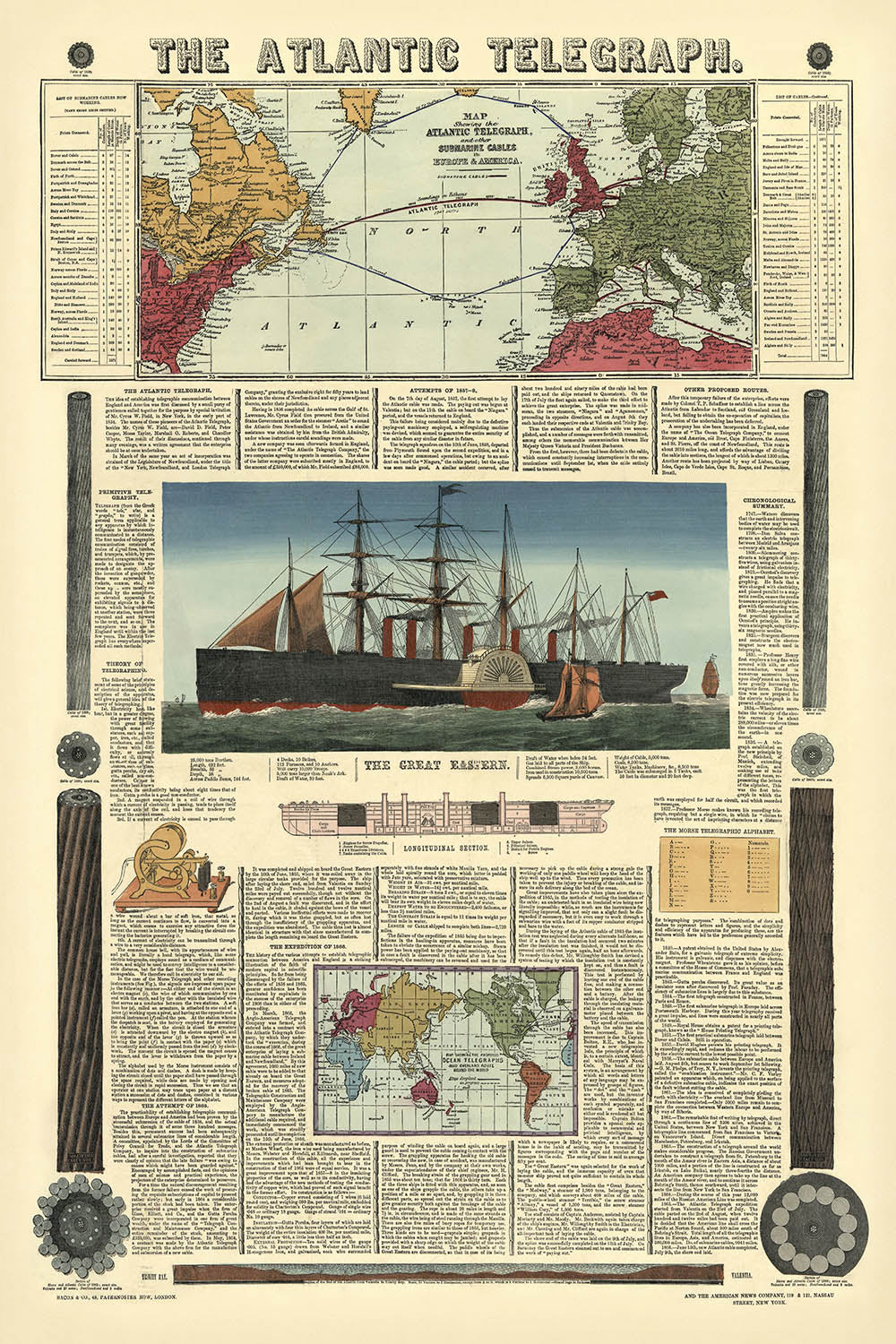Posséder cette carte, c'est comme tenir un morceau d'histoire entre vos mains. Elle capture un moment où le monde est devenu plus petit et plus connecté, grâce à l'esprit pionnier de ceux qui ont osé rêver d'une communication instantanée à travers d'immenses océans. Cette carte est parfaite pour les passionnés d'histoire, les collectionneurs, et quiconque apprécie le mélange complexe d'art, de science et d'histoire. Affichez-la fièrement comme un rappel de l'ingéniosité humaine et de la quête incessante du progrès.