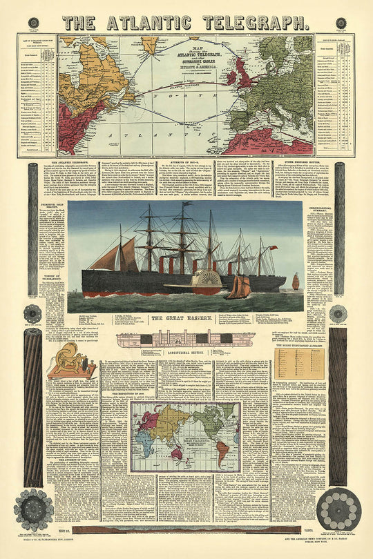 Le point central de cette carte est le magnifique paquebot Great Eastern, le vaisseau qui a rendu possible le câble télégraphique transatlantique. Ce navire, merveille de son époque, est représenté dans les moindres détails, accompagné d'une section longitudinale qui offre un aperçu de sa construction impressionnante. La carte comprend également une richesse de texte informatif, chroniquant l'histoire et l'importance du Télégraphe Atlantique, les défis rencontrés lors de sa pose, et le succès ultime de l'expédition de 1866. Ce récit enrichit la carte, en faisant non seulement un délice visuel mais aussi un trésor éducatif.