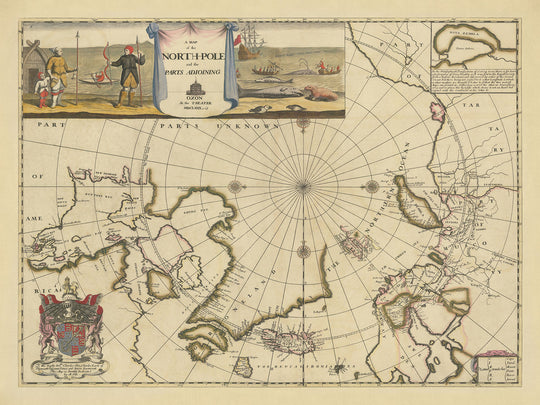 « Une carte du pôle Nord et des parties d'Adioining », créée par Moses Pitt en 1680, est un artefact remarquable de la première cartographie anglaise. Pitt, un cartographe visionnaire, s'est lancé dans un projet ambitieux visant à agrandir l'Atlas Maior de Jansson, une entreprise qui a finalement conduit à sa ruine financière. Malgré l'échec du projet, la carte du pôle Nord de Pitt se démarque comme une nouvelle production, distincte des cartes hollandaises rééditées qui constituaient la majeure partie de l'atlas. Cette carte représente non seulement les compétences cartographiques de Pitt, mais aussi sa détermination à contribuer à un travail original dans le domaine de la géographie.