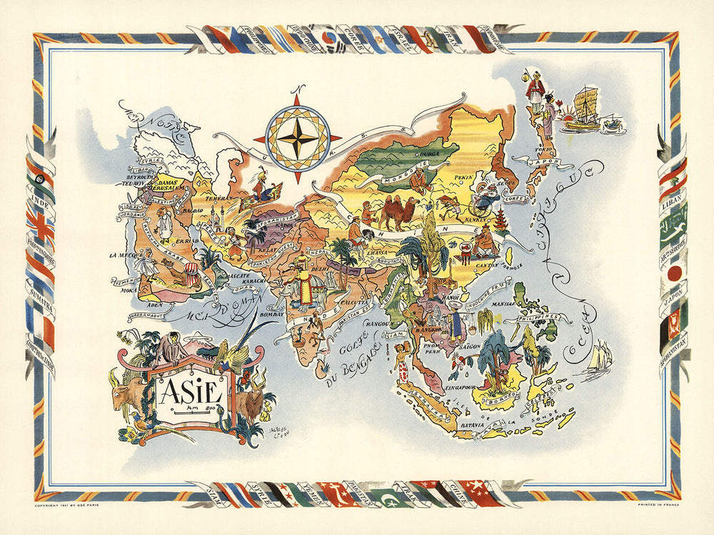 Jacques Liozu, célèbre pour ses cartes thématiques et picturales, imprègne « l'Asie » d'un mélange unique d'art et de précision. Son expertise est évidente dans le cartouche de titre décoratif et les bordures de la carte, qui présentent un éventail de drapeaux et de symboles qui ajoutent une touche d'élégance et de contexte historique. Le choix de Liozu d'exclure la Russie de cette carte met l'accent sur la concentration sur les régions centrales de l'Asie, offrant ainsi une exploration plus concentrée des dynamiques complexes du continent.