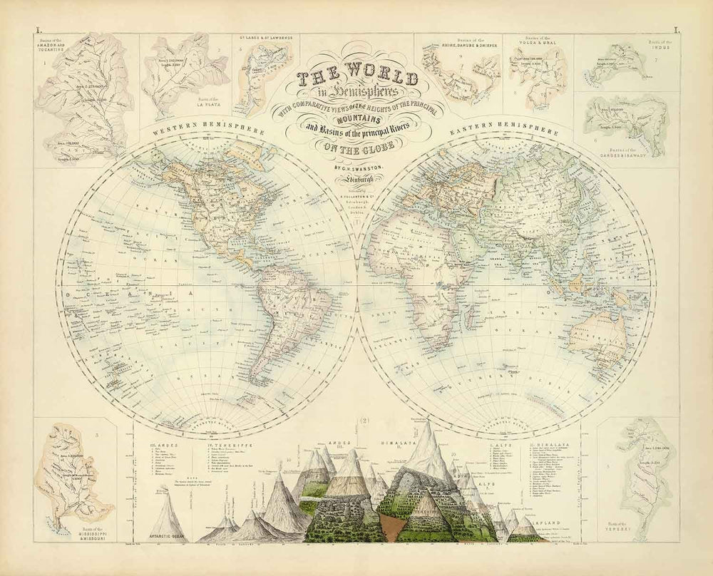 La carte du monde est entourée de magnifiques détails, tels que des illustrations des principaux systèmes fluviaux du monde (Amazon, Volga, Danube, Mississippi Missouri, etc.) et également une vue latérale des plus grandes chaînes de montagnes du monde (Himalaya, Andes, Alpes, et quelques autres). Curieusement, l'Everest (alors connu sous le nom de pic XV) n'est pas montré. Au lieu de cela, le Kangchenjunga est présenté comme la plus haute montagne du monde - mais plus tard, il serait révisé à la 3ème place et l'Everest serait couronné la plus haute.