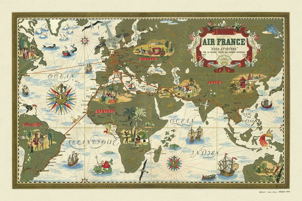 - Routes maritimes : Itinéraires Air France indiqués avec des lignes reliant les principales villes.