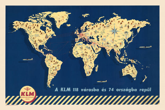 Ancienne carte du monde des itinéraires aériens de KLM, 1955: 118 itinéraires, 74 pays, repères picturaux