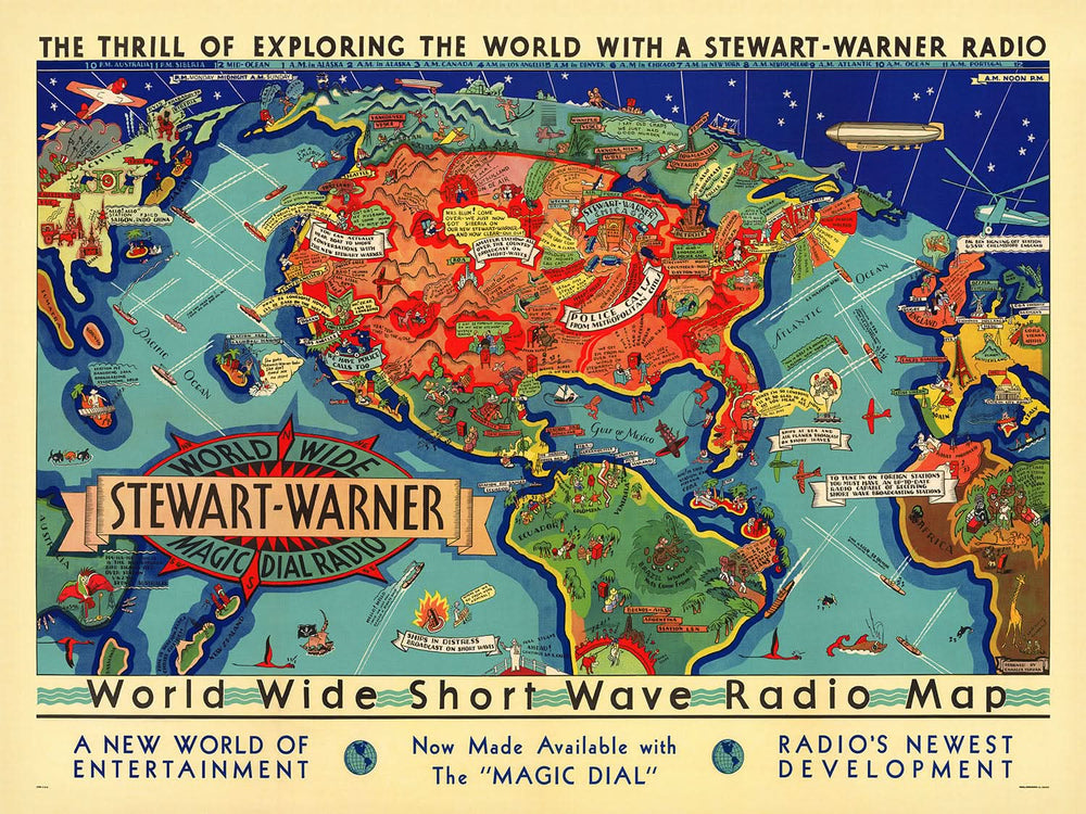 Cette carte a été publiée par la Stewart-Warner Corporation, l'un des principaux fabricants d'instruments et d'appareils du début des années 1900. Cette carte thématique et illustrée reflète la fascination de l'époque pour la technologie radio, mettant en valeur la portée mondiale de la radio à ondes courtes. Elle invite les téléspectateurs à imaginer le nouveau monde de divertissement et d'exploration que promettait la radio, reliant des terres et des cultures lointaines grâce à la magie des ondes.