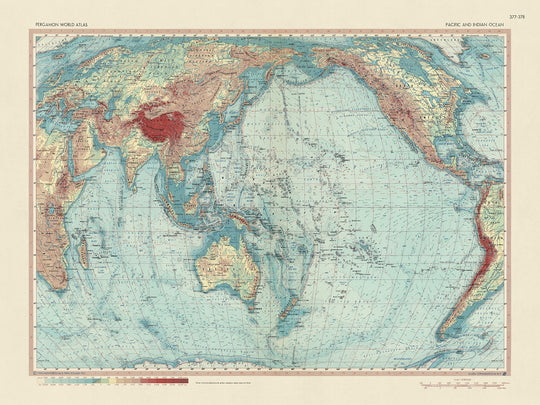 Ancienne carte du monde de l'océan Pacifique et de l'océan Indien, 1967: carte politique et physique détaillée