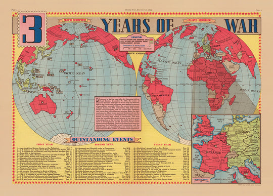 Ancienne carte de la Seconde Guerre mondiale, 1945: "3 ans de guerre" par Edwin Sundberg