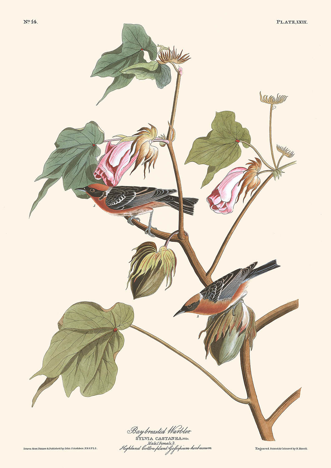 La Paruline à gorge rousse elle-même est un sujet captivant. Audubon a documenté comment elle migre à travers les États-Unis, mais seulement brièvement, avec des observations dans divers États allant de la Pennsylvanie à la Louisiane. Le mâle Paruline à gorge rousse se distingue par sa tête et son cou antérieur rouge châtaigne, avec des accents noirs et jaune-blanc frappants, ce qui en fait un délice visuel pour tout amateur d'oiseaux.