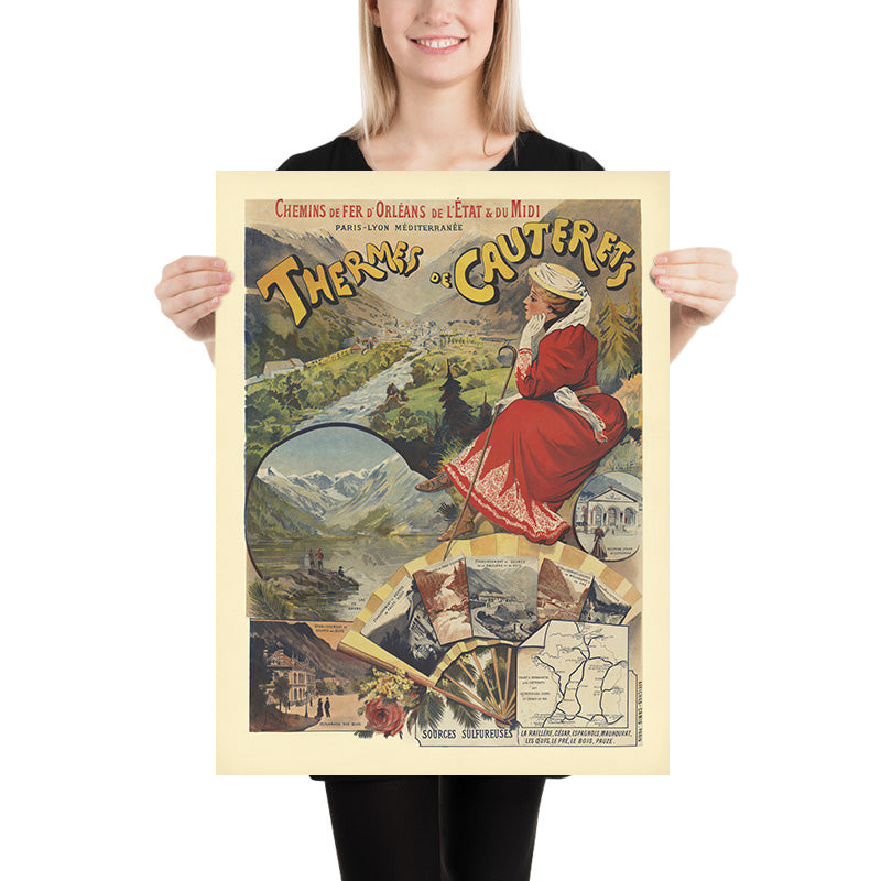 About the subject: Cauterets, in the Hautes-Pyrénées, was a premier spa destination celebrated for its sulfur springs and hiking routes to high alpine lakes and waterfalls. The poster’s vignettes name beloved local sights and establishments—Lac de Gaube, Cascade du Pont d’Espagne, Vallée de Lutour, Établissement et Source de la Raillère et du Bois, Établissement et Source de Mauhourat et du Pré, and Établissement et Source des Œufs—alongside the town’s “Sources César et Espagnols.” A small map titled Trajet à Pierrefitte près Cauterets shows connections from the principal railway lines, placing the Pyrenean resort within easy reach of Paris, Bordeaux, Toulouse, and beyond.