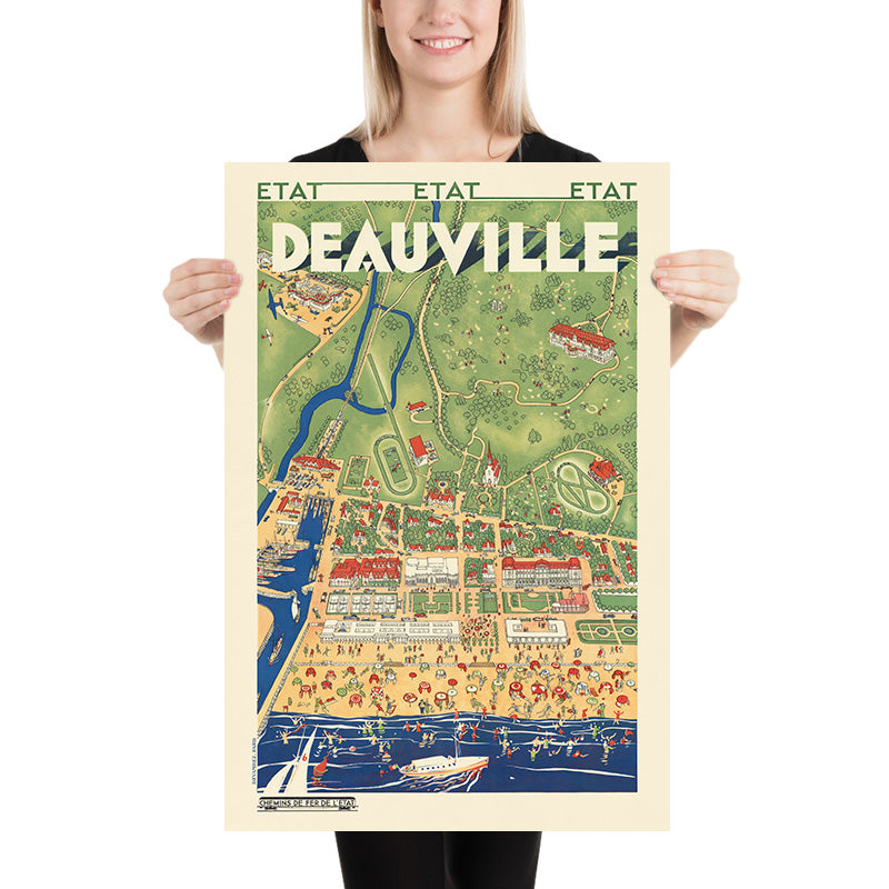 Deauville itself needs little introduction: a short train ride from Paris, it became the Riviera of the North—favored by fashion houses, film stars, and racing aficionados. The racetracks at Deauville-La Touques and nearby Clairefontaine, the iconic striped beach umbrellas on Les Planches boardwalk, and the Grand Hôtel all contributed to a glamour that railway posters like this helped define. Owning this image is like holding a ticket to the 1930s season—when weekends meant sea air, polo on green lawns, and evenings at the casino.