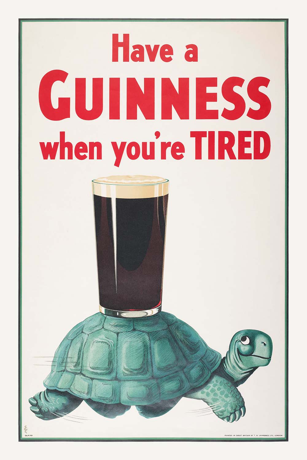 L'affiche « Ayez une Guinness quand vous êtes fatigué » se distingue comme l'une des créations les plus mémorables de Gilroy. L'humour doux de la tortue—un animal réputé pour son rythme lent—associé à la promesse de rajeunissement d'un verre de Guinness, encapsule parfaitement le message ludique et accessible de la campagne. Le slogan lui-même s'inspire des réponses des véritables clients de pub, ancrant l'œuvre dans la culture authentique et la vie sociale de la Grande-Bretagne des années 1930.