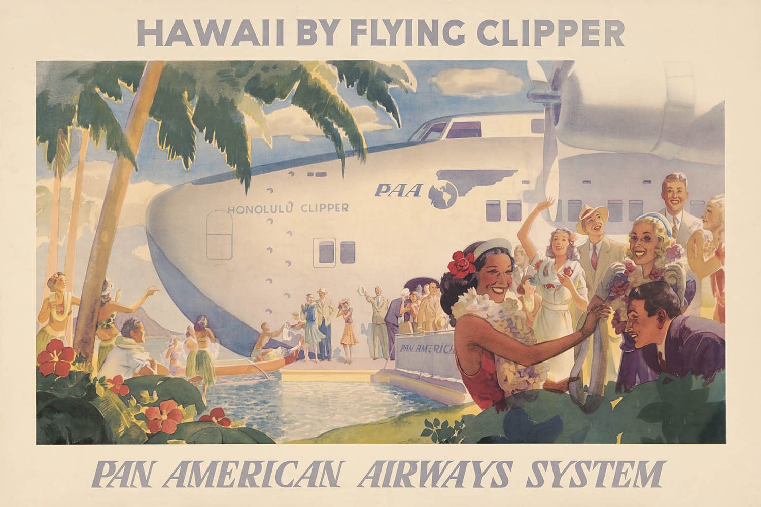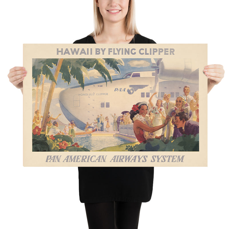 Hawaii by Flying Clipper – Pan American Airways System (1938) is a radiant Art Deco travel poster created to entice travelers to the islands at the dawn of long‑distance commercial aviation. Issued by Pan American Airways System, the image celebrates the era when “flying clippers” made the Pacific feel newly accessible, blending island romance with the sleek promise of modern flight. With tropical florals, palm fronds, leis, and well-dressed visitors set beneath a streamlined seaplane, the composition distills the interwar dream of glamorous escape to Hawaii’s shores.