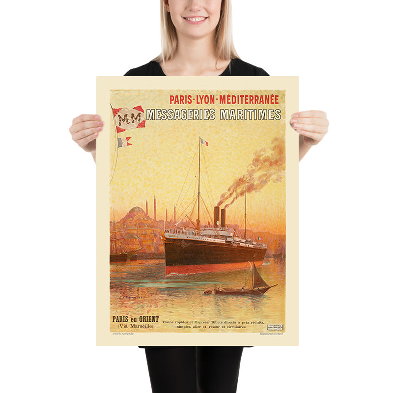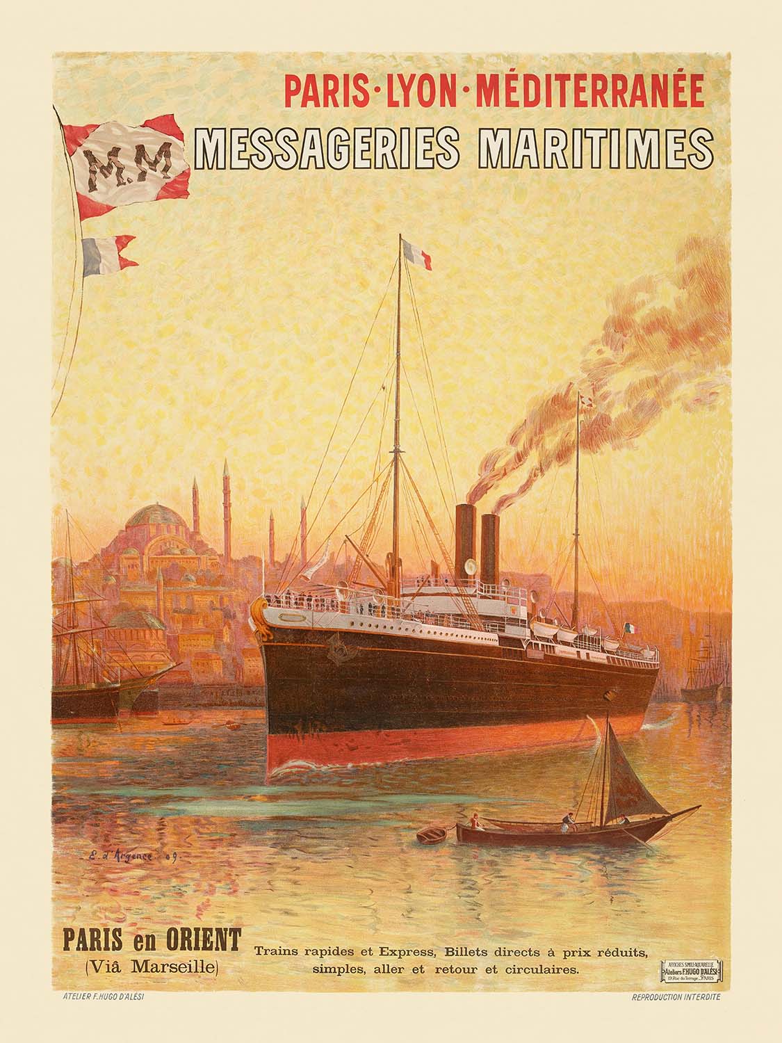 The subject is as historic as it is romantic. Messageries Maritimes was a major French shipping company that connected Europe with the Levant, North Africa, and onward to Asia—routes made swifter and more fashionable after the opening of the Suez Canal. In 1909, steamers and rail linked Paris to these ports with unprecedented ease, and the phrase “Paris en Orient” condensed that promise: Parisian style carried across the seas to Istanbul, Alexandria, Beirut, and beyond. This poster doesn’t just sell tickets; it sells an era’s fascination with modern speed meeting ancient skylines.