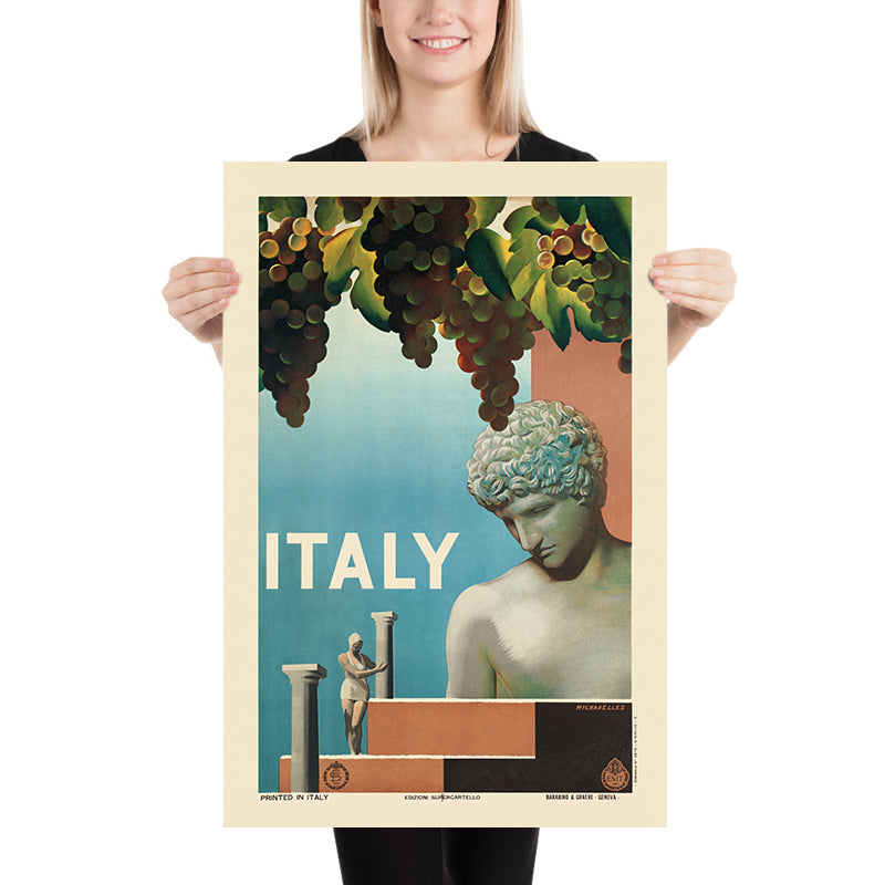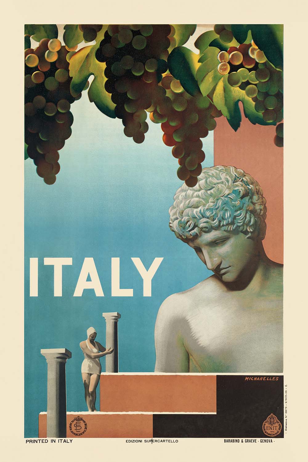 Italy by Michahelles is an antique travel poster that channels the pulse of early 20th‑century Italian Futurism into a graceful celebration of place. A sculptural profile, lush grapes, and streamlined figures converge to present Italy as both timeless and modern—where classical heritage meets the dynamism of a nation welcoming travelers. The composition’s interplay of Mediterranean blues, vineyard greens, and warm earth browns captures the country’s light, culture, and abundance, inviting the viewer to imagine sunlit piazzas, coastal breezes, and hillside vineyards.