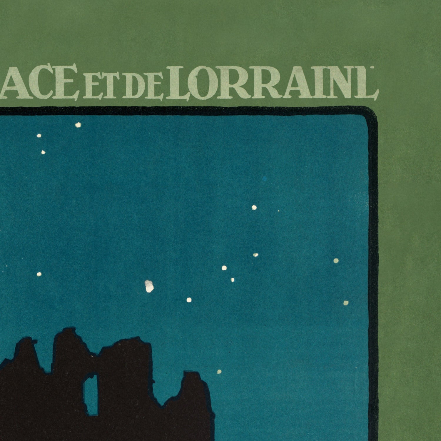 Kaysersberg is celebrated here in an antique travel poster from the Art Nouveau era by an unknown artist, created to entice rail travelers to the heart of Alsace. The composition leads your eye up a medieval street toward hilltop ruins, with timber-framed houses and a silhouetted castle setting the scene for an evening in this picturesque wine-town. Crafted in the flowing, nature-inspired idiom of fin-de-siècle design, the poster captures the romance of regional travel at a moment when Alsace’s cultural identity was a subject of revived pride and curiosity.