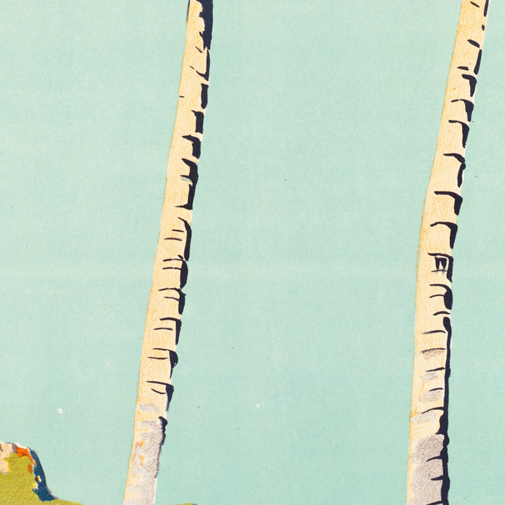 Lovely Lindeman for sunny carefree holidays. An island jewel in a coral sea is a radiant celebration of Australia’s tropical allure, created by an anonymous mid-century poster artist. Centered on Lindeman Island in Queensland’s Whitsundays—at the edge of the Great Barrier Reef—the image distills the era’s promise of escape into sea-breeze silhouettes, waving palms, and a sunlit shoreline. With its bold outlines, simplified figures, and breezy hand-lettered typography, this vintage travel poster captures the optimism of post-war leisure and the irresistible pull of a coral-sea paradise.