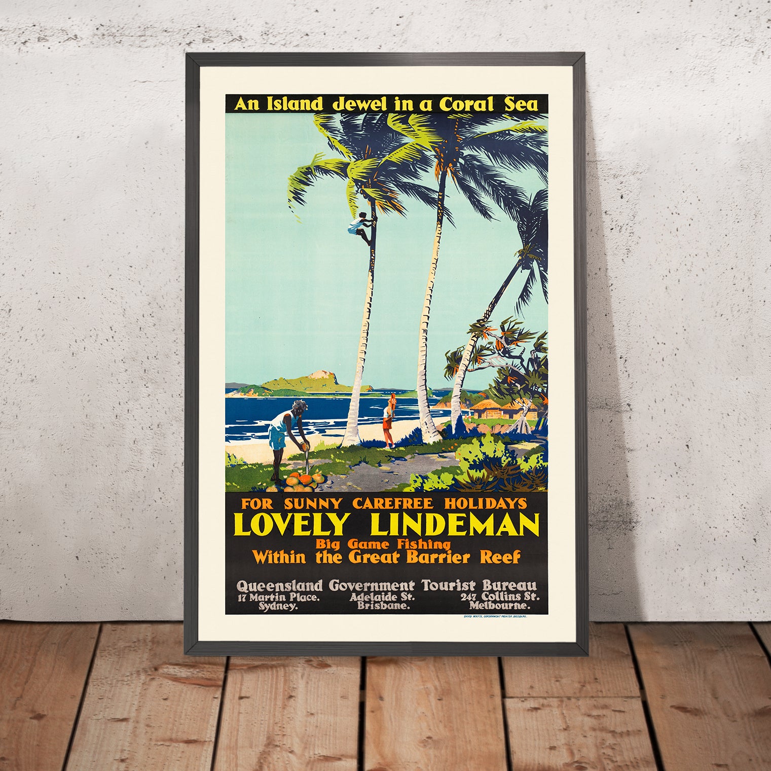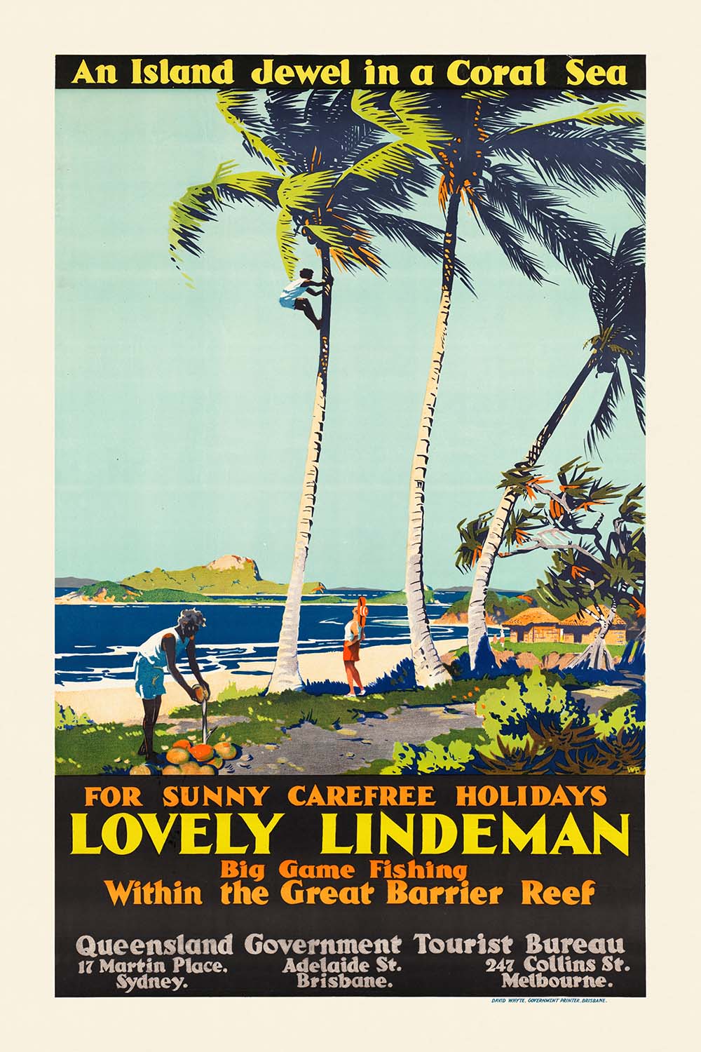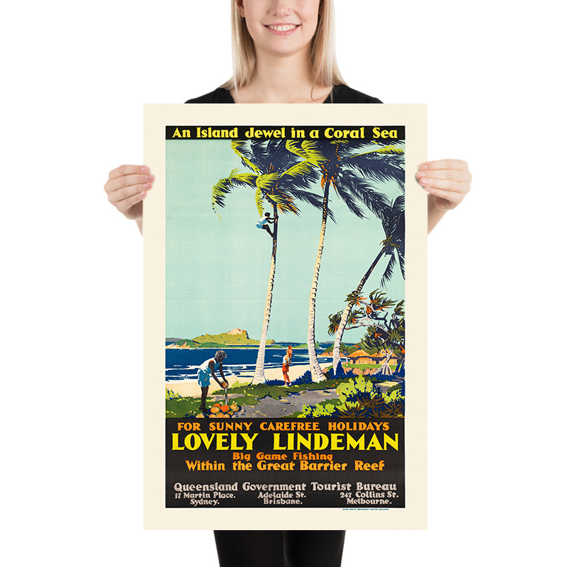 The subject itself is a gem of travel lore. Lindeman Island sits within the Whitsunday archipelago—a constellation of isles fringed by coral reefs and calm, lagoon-like waters. As tourism expanded in the middle decades of the 20th century, posters like this one helped define Queensland as the “sunshine state,” inviting swimmers, sailors, and honeymooners to trade winter grey for tropical color. This design would have been displayed in travel agencies and on transport routes, fueling the era’s growing appetite for holidays in the Reef.