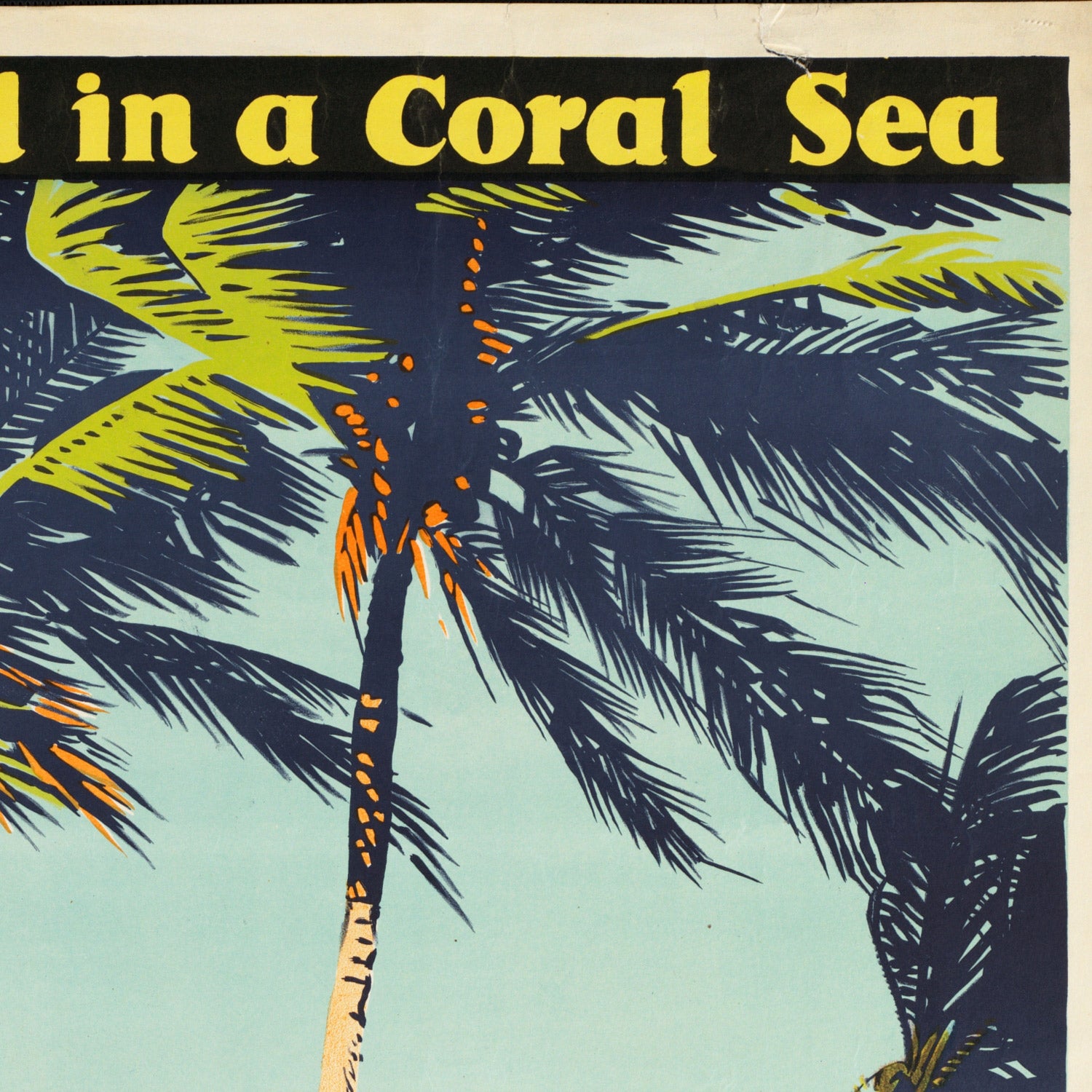The palette is a masterclass in escapist color. A luminous blue sky and sea are cooled by lush greens in the palms, while accents of orange and golden yellow suggest warm sunlight on sand and skin. Repeating palm fronds create a rhythmic canopy that draws the eye upward, framing curvilinear figures and surf with sweeping arcs. Flat, decisive color blocks and crisp silhouettes emphasize clarity and mood over realism—exactly the qualities that make mid-century travel posters so collectible today. Hang it for an instant hit of summer: it’s perfect for coastal interiors, mid-century modern rooms, or any space that craves a little warmth and wanderlust.