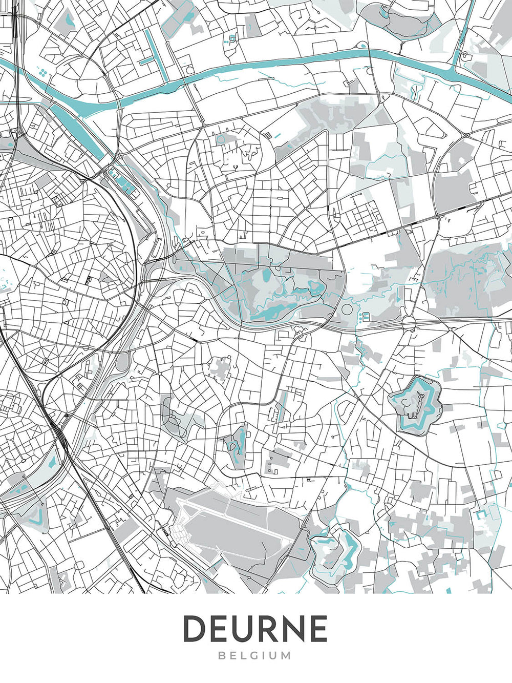 Plan de la ville moderne de Deurne, Belgique : hôtel de ville, parc Rivierenhof, complexe sportif Luchtbal, A12, N13