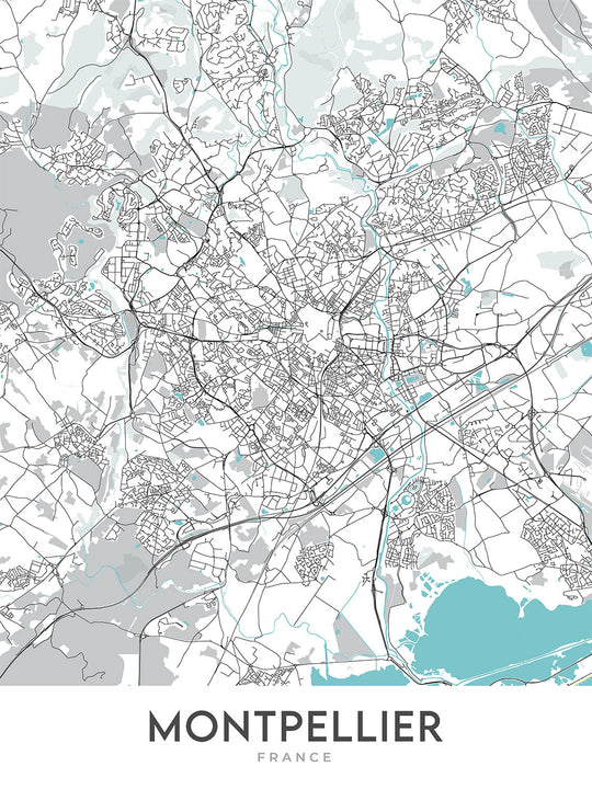 Ce plan de Montpellier est un plan de ville moderne, comportant un plan détaillé des rues sans étiquettes. La carte couvre une zone rectangulaire qui englobe le centre-ville et ses quartiers environnants. La ville de Montpellier est située dans la région Occitanie du sud de la France et est connue pour sa riche histoire, sa culture et son architecture. Cette carte met en valeur l'énergie vibrante et le charme moderne de la ville, ce qui en fait une œuvre d'art murale idéale pour toute maison ou bureau.