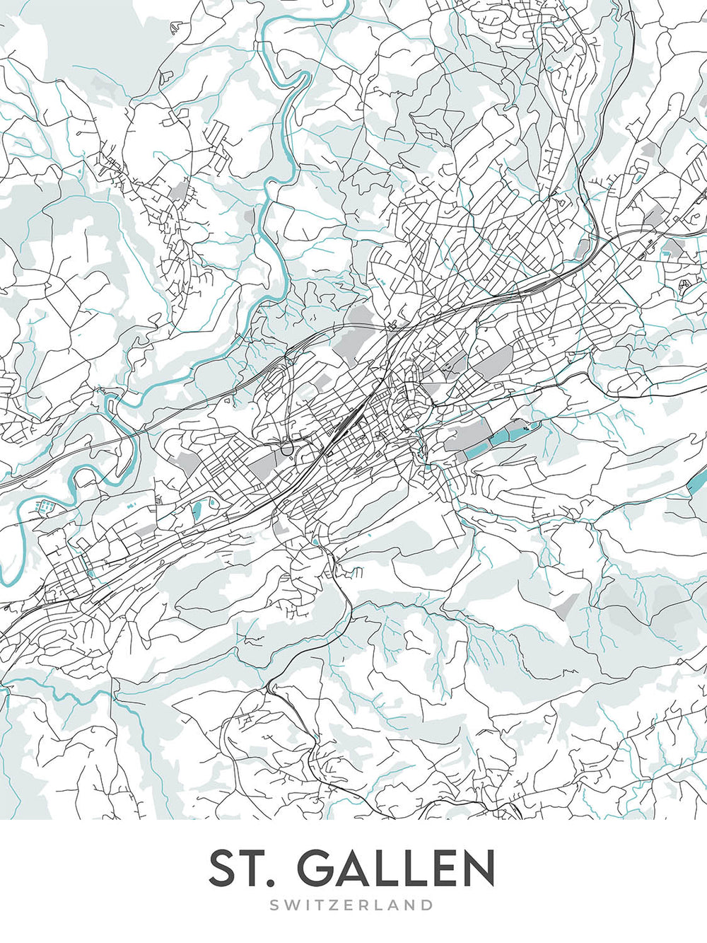 La carte se concentre sur la ville de Saint-Gall et ses environs, offrant un aperçu détaillé des rues, des monuments et des quartiers de cette belle ville. La carte est parfaite pour ceux qui souhaitent explorer la ville ou pour ceux qui souhaitent simplement ajouter une touche de design moderne à leur maison ou leur bureau.