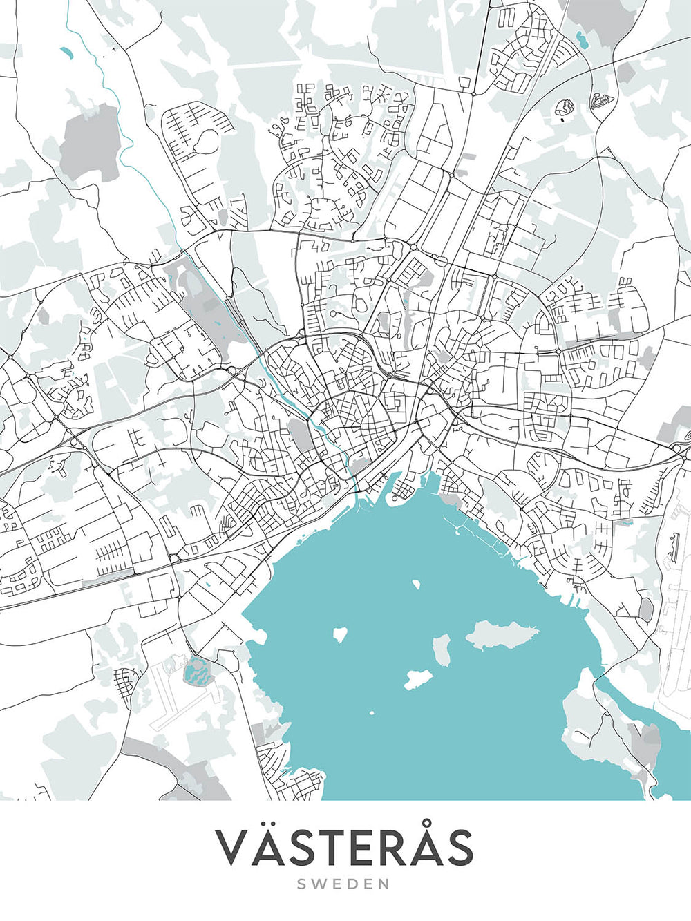 Plan de la ville moderne de Västerås, Suède : château, cathédrale, salle de concert, université, zoo