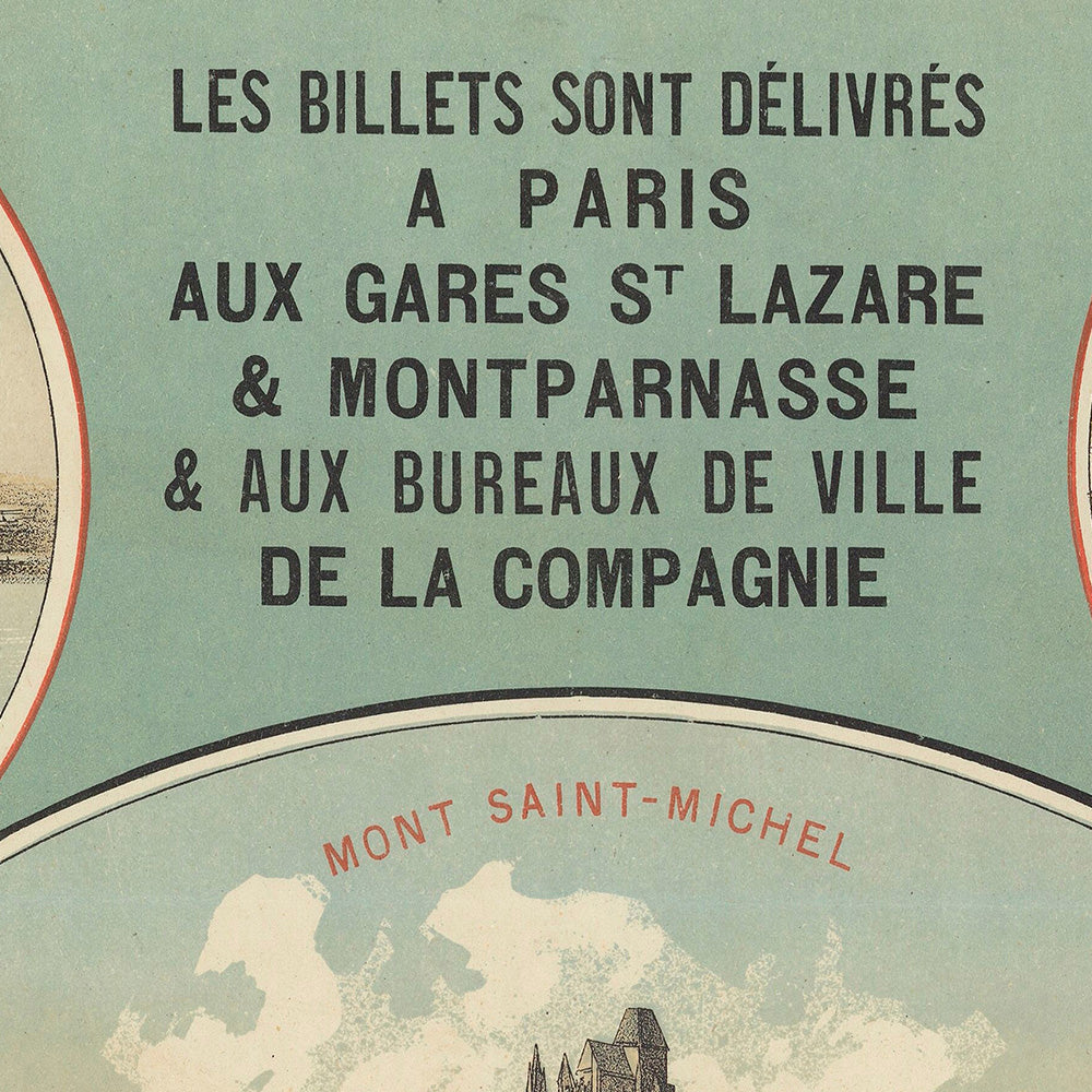 The subject is a snapshot of a great social shift: the railway bringing seaside holidays within reach. Chemins de Fer de l’Ouest linked Paris to the Channel coast, and this poster reads like a summer itinerary—low‑fare tickets from the capital to cliff‑lined Fécamp, the fortifications of Saint‑Malo, the fashionable promenade at Dieppe, the stylish plage at Trouville, and the timeless silhouette of Mont‑Saint‑Michel. For anyone who has wandered these harbors or watched the tide race across the bay, the geography is the star.
