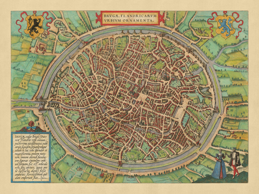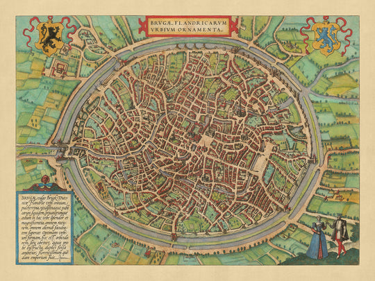 Ajoutant au charme de la carte, les illustrations réfléchies qui l'accompagnent, y compris un couple se tenant dans le coin inférieur droit, symbolisant peut-être la vie et l'esprit des habitants de la ville. Le cartouche décoratif dans le coin supérieur gauche renforce encore l'attrait esthétique de la carte, la rendant non seulement un document historique mais aussi une œuvre d'art. Ces éléments artistiques, associés à la représentation détaillée de Bruges, en font une pièce captivante pour les collectionneurs, les historiens et les passionnés d'art.