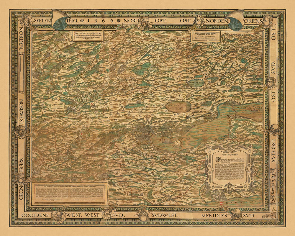 L'importance historique de la carte de Murer s'étend au-delà de son attrait esthétique. Il témoigne des techniques cartographiques et des sensibilités artistiques de la Renaissance. La capacité de la carte à représenter à la fois le paysage géographique et culturel de Zurich au XVIe siècle en fait un objet précieux. Que vous soyez collectionneur, historien ou simplement admirateur de cartographie fine, cette carte propose un voyage captivant dans le temps, révélant la beauté complexe et la profondeur historique du canton de Zurich.