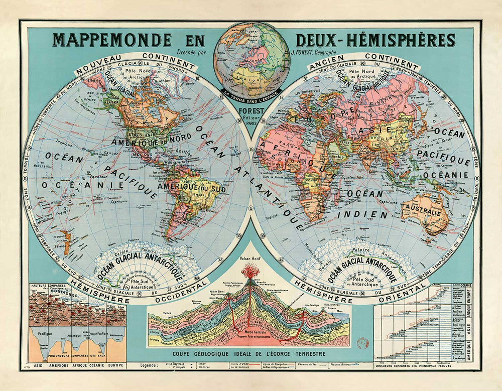 Cette magnifique carte du monde en double hémisphère a été publiée en 1925. Elle a été créée par Joseph Forest.