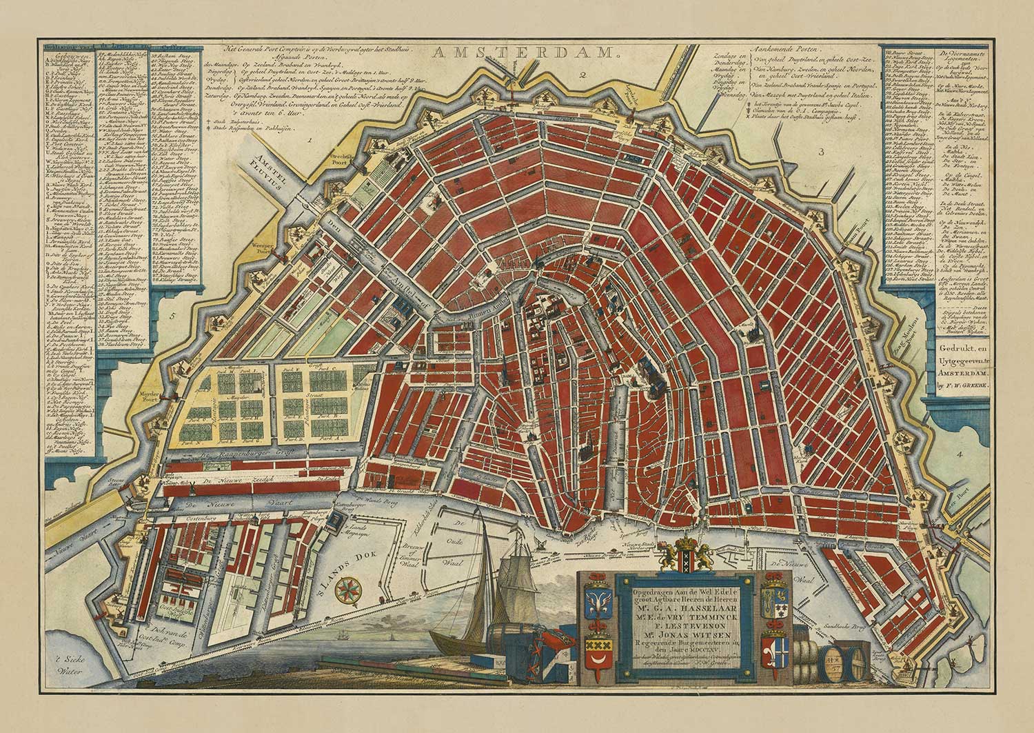 Cette magnifique carte ancienne d'Amsterdam a été publiée à l'origine en 1766. Elle a été créée par Frederik Willem Greebe.