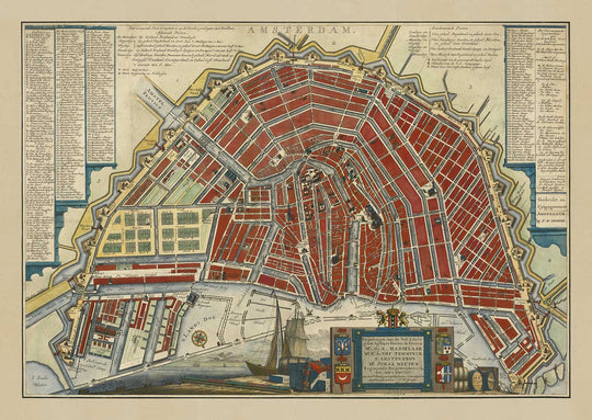 À l'époque où la carte a été créée, Amsterdam était une ville commerciale prospère et son port était l'un des plus actifs au monde. La ville était également connue pour sa scène culturelle dynamique, de nombreux artistes et écrivains célèbres ayant élu domicile à Amsterdam. Aujourd'hui, Amsterdam est toujours une destination touristique populaire, connue pour ses magnifiques canaux, son architecture historique et sa vie nocturne animée. La ville est également un centre d'affaires et d'innovation, avec de nombreuses startups technologiques et industries créatives basées dans la ville.