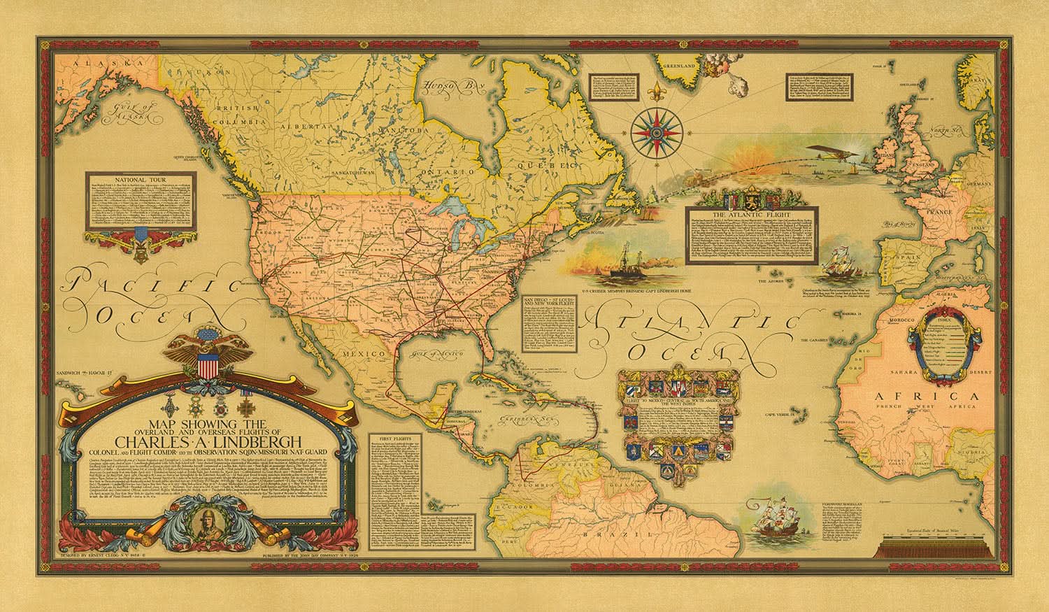 Ancienne carte des vols de Charles A. Lindbergh par Clegg, 1928: Histoire de l'aviation, itinéraires