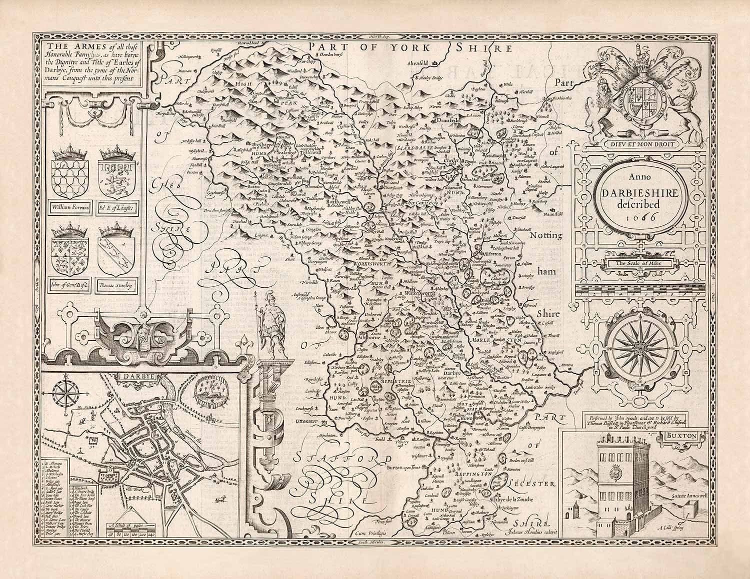 Old monochrome Carte of Derbyshire, 1611 par John Speed - Derby, Chesterfield, Buxton, Peak District