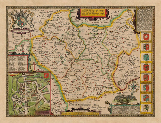 Cette ancienne carte en couleur, pleine et extrêmement rare, montre le comté ancien de Leicestershire en 1611. Elle a été créée par John Speed et gravée par Jodocus Hondius, et publiée à l'origine dans "The Theatre of the Empire of Great Britaine" de Speed. Cette version de la carte originale a été soigneusement restaurée par Unique Maps Co. et ne peut être achetée nulle part ailleurs.