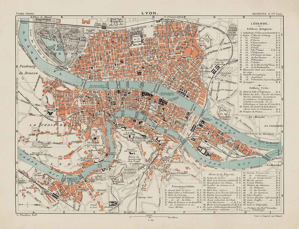 Plan ancien de Lyon, France en 1888 par Louis-Francois: La Basilique Notre Dame, le Rhône, la Saône, le Parc de la Tete d'Or, la Place des Terreaux