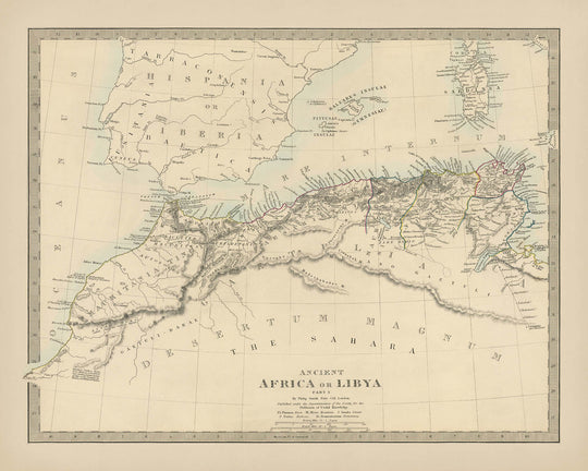 L'Afrique ancienne ou la Libye Partie I, réalisée par la célèbre Société pour la Diffusion des Connaissances Utiles (SDUK) en 1845, offre un aperçu captivant de la tapisserie géographique et historique de la région méditerranéenne occidentale. Cette carte, avec ses détails complexes, capture la côte africaine depuis l'île de Menix et Pons Zita, s'étendant au-delà des majestueuses montagnes de l'Atlas jusqu'à la côte atlantique. Elle reflète la fascination européenne du XIXe siècle pour l'Afrique, une terre de potentiel inexploité et de mystère, faisant d'elle un artefact significatif de l'ambition coloniale et de l'exploration.