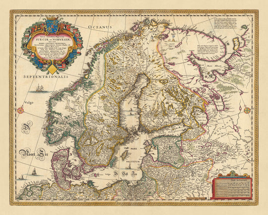 Cette carte à couper le souffle, intitulée 'Tabula exactissima Regnorum Sueciae et Norvegiae, nec non Maris Universi Orientalis Terrarumque adjacentium. Summo studio ab Andrea Bureo Sueco in lucem edita ... Un Nicolao Iohannide Piscatore', a été réalisé par Nicolaes Visscher II en 1690. Visscher II était le petit-fils de Claes Janszoon Visscher, un cartographe renommé pendant l'âge d'or néerlandais. Le titre se traduit par « Une carte très précise des royaumes de Suède et de Norvège, ainsi que de l'ensemble de la mer de l'Est et des terres adjacentes ». Avec beaucoup de diligence mis en lumière par le Suédois Andreas Bureus... par Nicolaes Visscher'.