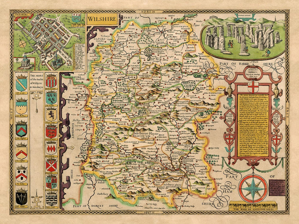 De nombreuses villes, villages et cités du comté de Wiltshire dans le sud-ouest de l'Angleterre sont déjà visibles sur cette carte. Dans le coin supérieur gauche se trouve une gravure détaillée de Salisbury, alors (et encore) la capitale de ce comté ancien. Dans le coin supérieur droit se trouve une belle gravure de Stonehenge avec quelques personnes bien habillées se promenant autour.