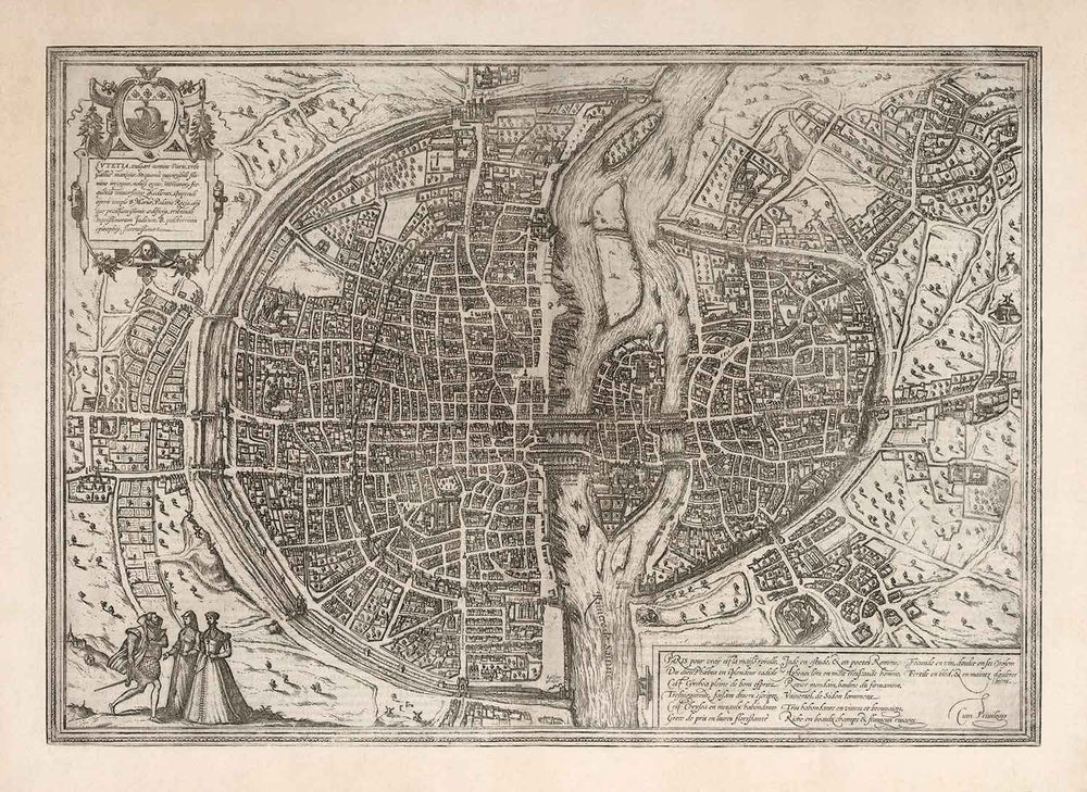Publié en 1572 par Georg Braun et Frans Hogenberg, il s'agit de la plus ancienne carte complète et vraie de Paris. Si Shakespeare avait jamais visité Paris, c'est à quoi cela aurait ressemblé. Cette carte a été publiée pour la première fois dans Civitates Orbis Terrarum - les Villes du Monde - qui était un chef-d'œuvre cartographique comportant 546 cartes.